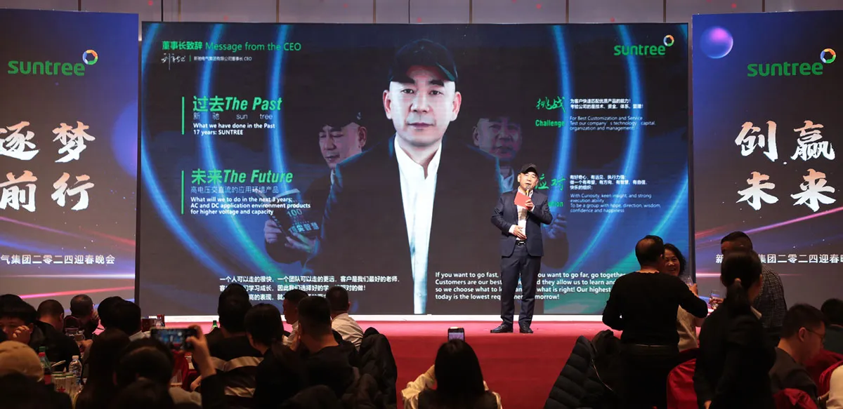 14. tammikuuta 2024 SUNTREE Electric Group Co., Ltd:n vuotuinen tapahtuma – SUNTREE Groupin loppuvuoden seremonia – järjestettiin onnistuneesti Xinxinya-hotellissa.Vuosikokouksen teema on ”Tavoite tulevaisuuteen”, jonka tarkoituksena on tarkastella edellisen vuoden saavutuksia ja katsoa tulevaisuuden kehityssuunnitelmaa.