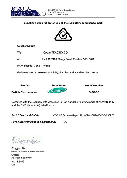 DC1200V-erotuskytkin sai RCM-sertifikaatin Australiassa